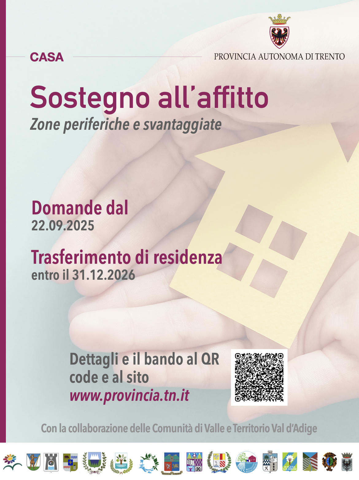 E’ concesso dalle Comunità di valle e dal Territorio Val d'Adige (Comune di Trento) ai nuclei familiari che a partire dal 13 settembre 2025 stipulano un contratto d'affitto per un alloggio in dette zone e vi trasferiscono la residenza anagrafica. Il contributo all'affitto è determinato in 3.000 euro annui e viene riconosciuto per un periodo di tre anni.